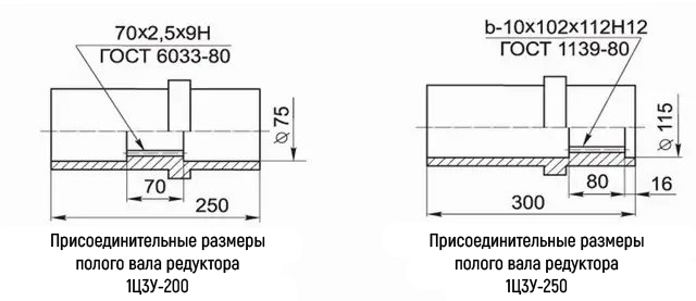 Размеры валов редуктора 1Ц3У-200, которые производятся в виде конуса