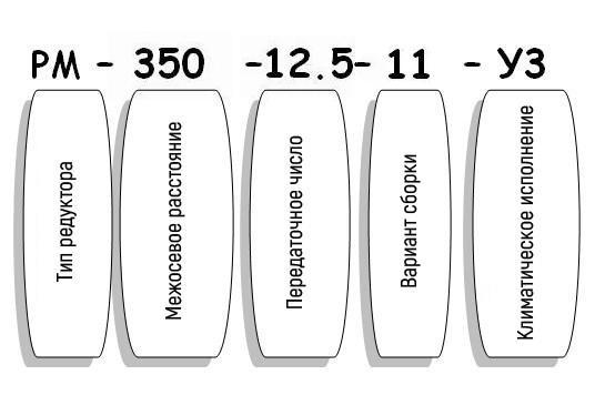 Редуктори РМ-350-12.5-11 випускають з одним вхідним та одним вихідним валом. Кінці валів виходять на один бік і мають форму зубчастої муфти або його частини.